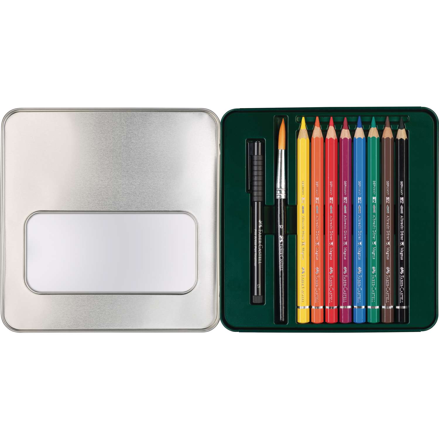 Deze Albrecht Dürer Mixed Media cadeauset van Faber-Castell bevat 8 extra dikke Albrecht Dürer Magnus aquarelpotloden, met een kleurstift van maar liefst 5,3 mm. doorsnede. Verder zitten er een PITT® artist pen en een aquarelpenseel in deze set.